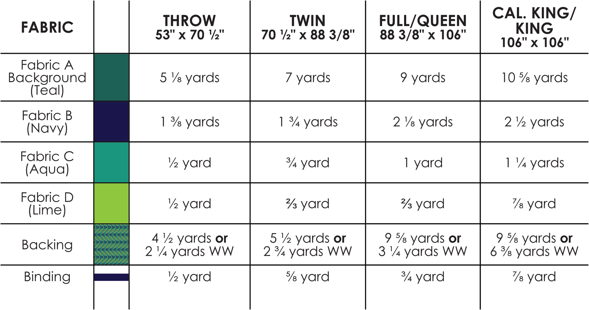 The quilt can finish in practically any size you'd like, but as laid out, the following sizes finish as follows: